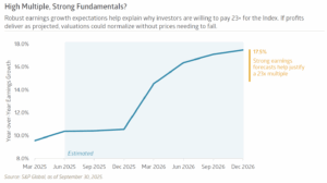 What remains is a fully priced U.S. large-cap equity market. The S&P 500 entered the final quarter of 2025 trading at nearly 23x estimated earnings over the next 12 months. Fed Chair Jerome Powell acknowledged as much in a late September speech: “…by many measures, for example, equity prices are fairly highly valued.” Investors seem willing to pay the price, however, emboldened by both the long-term promise of AI and rosy estimates for near-term earnings growth. S&P tabulates that S&P 500 earnings per share growth for 2026 is currently tracking at more than 17%. It could prove overly optimistic, but it does help explain why valuations are rich in an environment where the Fed is also cutting interest rates. Valuations remain much more restrained outside of the tech-heavy S&P 500 Index, with smaller company stocks and foreign equities relatively attractive.