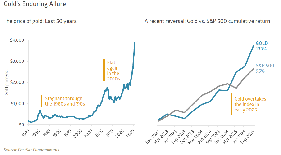 A funny thing happened on the way to coronate our new AI ruling class, though. Investors have once again developed a gold crush. In fact, the price of the alluring metal—which has captured imaginations for thousands of years—outpaced the stock market over the trailing three years, roughly since ChatGPT launched. The following page’s exhibit shows that gold soared 133% over that timeframe, ahead of the S&P 500 Index’s 95% total return. Not typically mistaken for a growth stock, it has been a goldilocks environment for the yellow metal. The Consumer Price Index (CPI) hit a peak of 9.0% year-over-year inflation in mid-2022, highest in over 40 years. This pushed some investors into gold as a store of value, or a way to avoid a loss of purchasing power. Inflation has normalized since, decelerating to 2.9% growth as of August 2025, but it has not reversed, which means prices continue to climb overall.