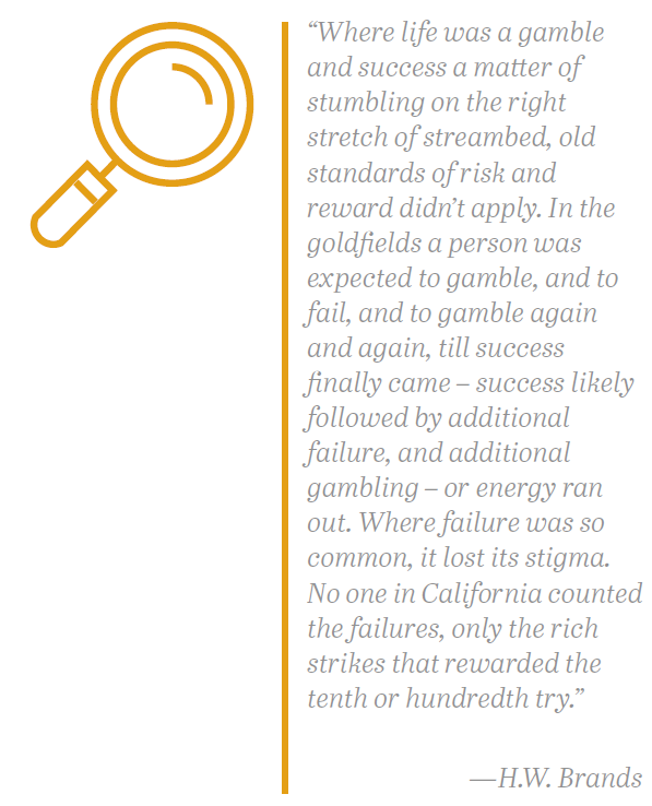 This “build it and they will come” approach takes a certain boldness, a disregard for potential failure. Brands described the same mindset as occurring during the gold rush: “Where life was a gamble and success a matter of stumbling on the right stretch of streambed, old standards of risk and reward didn’t apply. In the goldfields a person was expected to gamble, and to fail, and to gamble again and again, till success finally came – success likely followed by additional failure, and additional gambling – or energy ran out. Where failure was so common, it lost its stigma. No one in California counted the failures, only the rich strikes that rewarded the tenth or hundredth try.”4