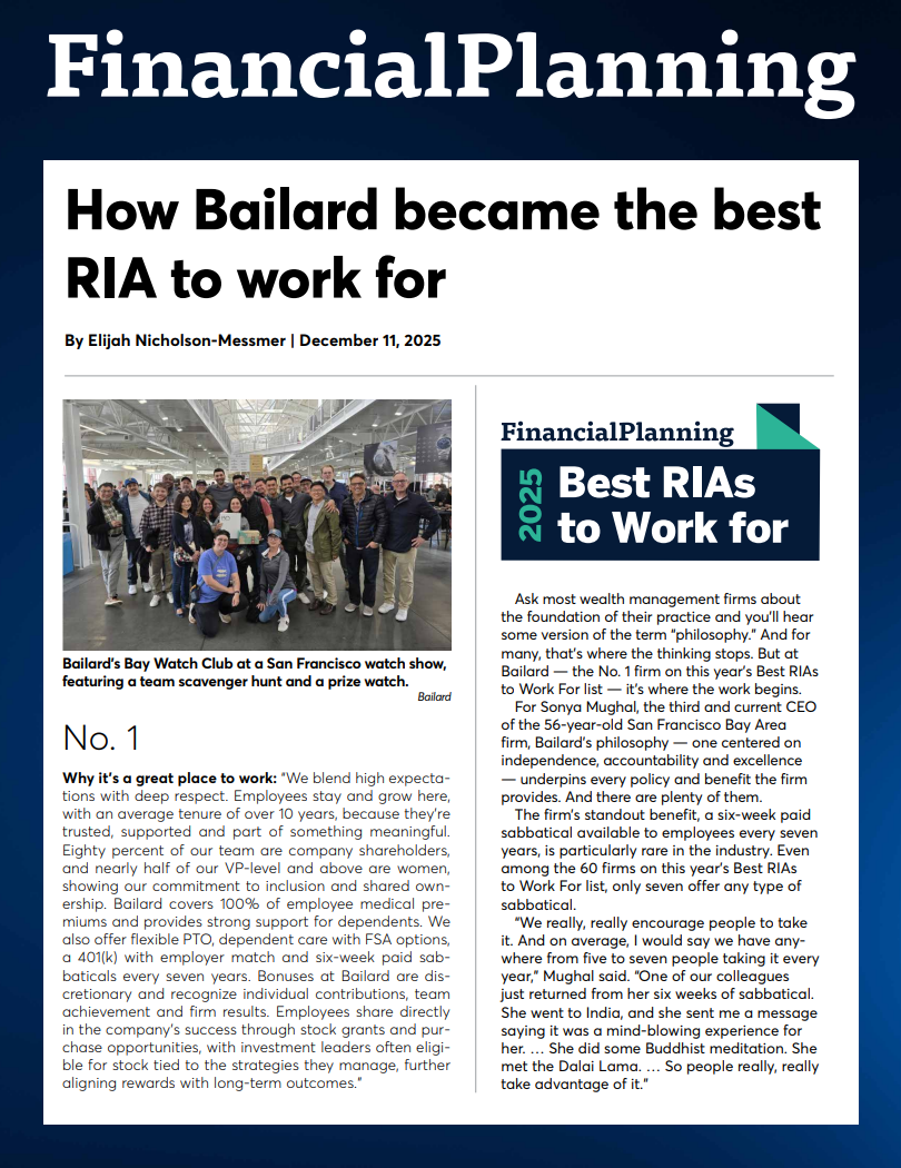 This recognition reflects the strength of our team and the culture that drives our work every day. A thriving workplace leads to better service, deeper relationships, and more thoughtful financial guidance. Our people are the foundation of our success, and this award underscores our dedication to attracting and retaining top talent in the wealth management industry. With Bailard’s first-place ranking came an interview with CEO Sonya Mughal, CFA, in which Financial Planning explored the firm’s approach to building an environment that supports lasting careers.